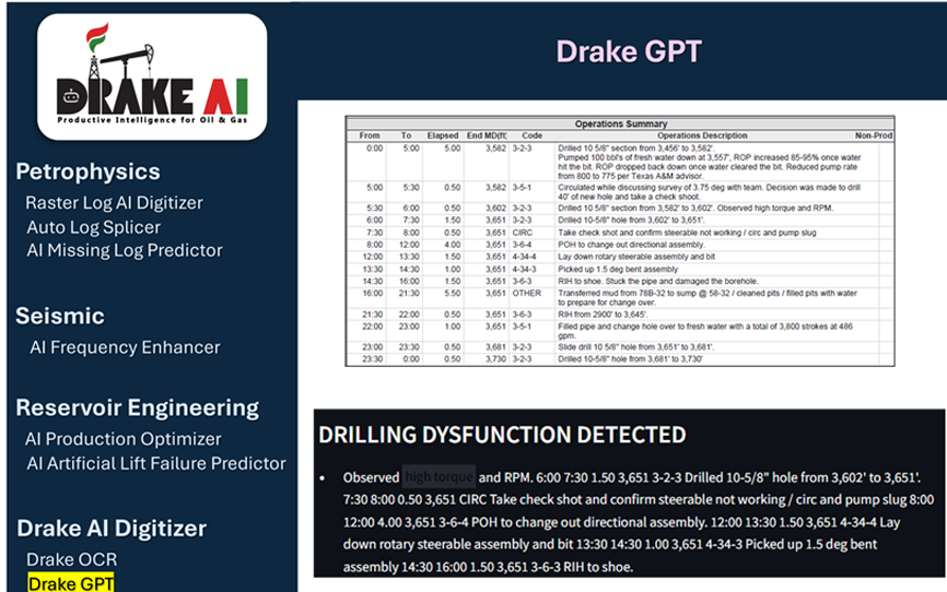 Drake AI uses OCR, NLP, and GPT-based models to extract, summarize, and answer questions from well and field reports. It also detects drilling dysfunctions by analyzing patterns in unstructured text data.