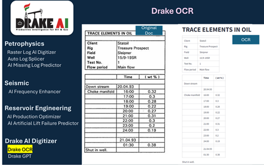 Drake AI uses OCR with advanced AI/ML to extract structured data from unstructured well and field reports, enabling fast, accurate digitization for easier analysis, integration, and decision-making.