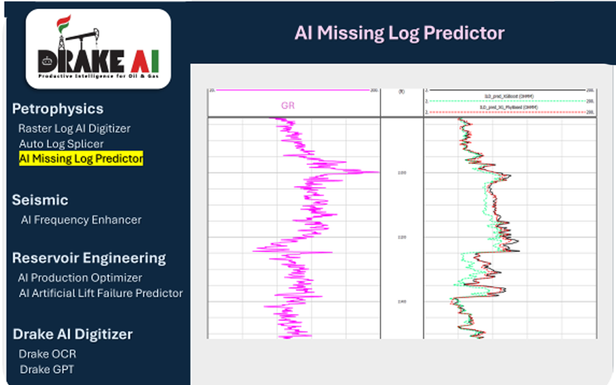 Drake AI uses AI and ML models trained on regional log data to predict missing curves with high accuracy, enabling better reservoir characterization and decision-making even when original logs are incomplete or absent.