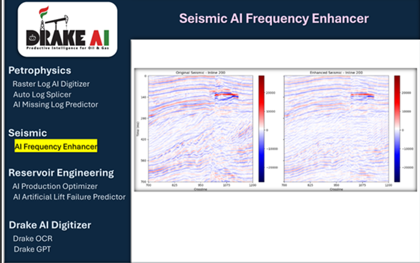 Drake AI uses deep learning and CNNs to reconstruct missing seismic frequencies by learning spatial patterns and spectral relationships, enhancing resolution and improving subsurface imaging accuracy.